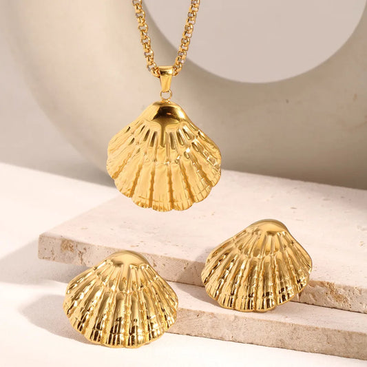 Wholesale Jewelry Marine Style Shell 304 Stainless Steel 18K Gold Plated Square Pearl Chain Earrings Necklace Jewelry Set