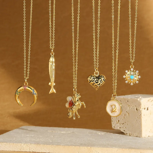 Unique Cute Dolphin Zircon Moon Tooth Oil Drop Heart Shaped Snowflake Necklace Gold Plated Copper Chain Lobster Clasp