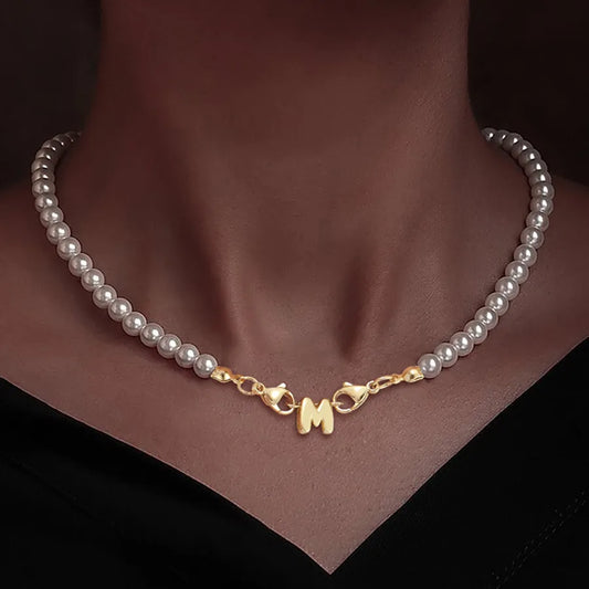 304 Stainless Steel Artificial Pearl Beaded Chain Letter Pendant Necklace