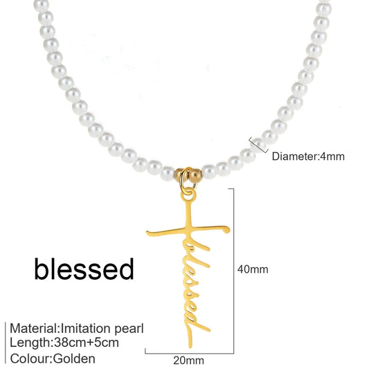 Elegant Simple Style Cross Letter 304 Stainless Steel Imitation Pearl Beaded Chain Beaded Necklaces Wholesale