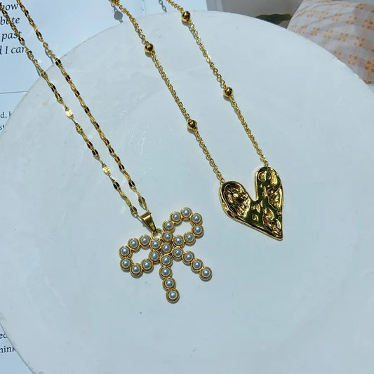 Wholesale Jewelry Sweet Heart Shape Bow Knot 304 Stainless Steel Copper Imitation Pearl 18K Gold Plated Inlay Pendant Necklace cable chain