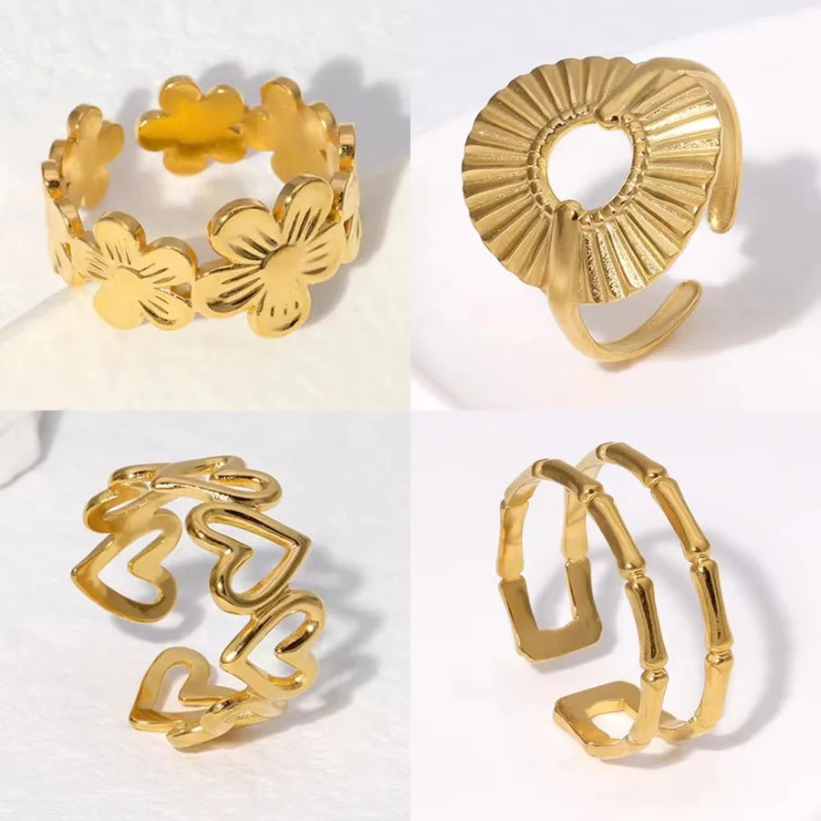 Anillos abiertos chapados en acero inoxidable con forma de corazón y flores de estilo simple
