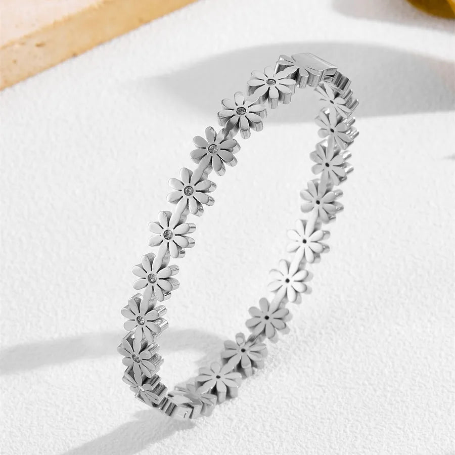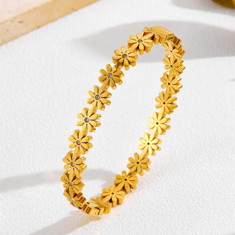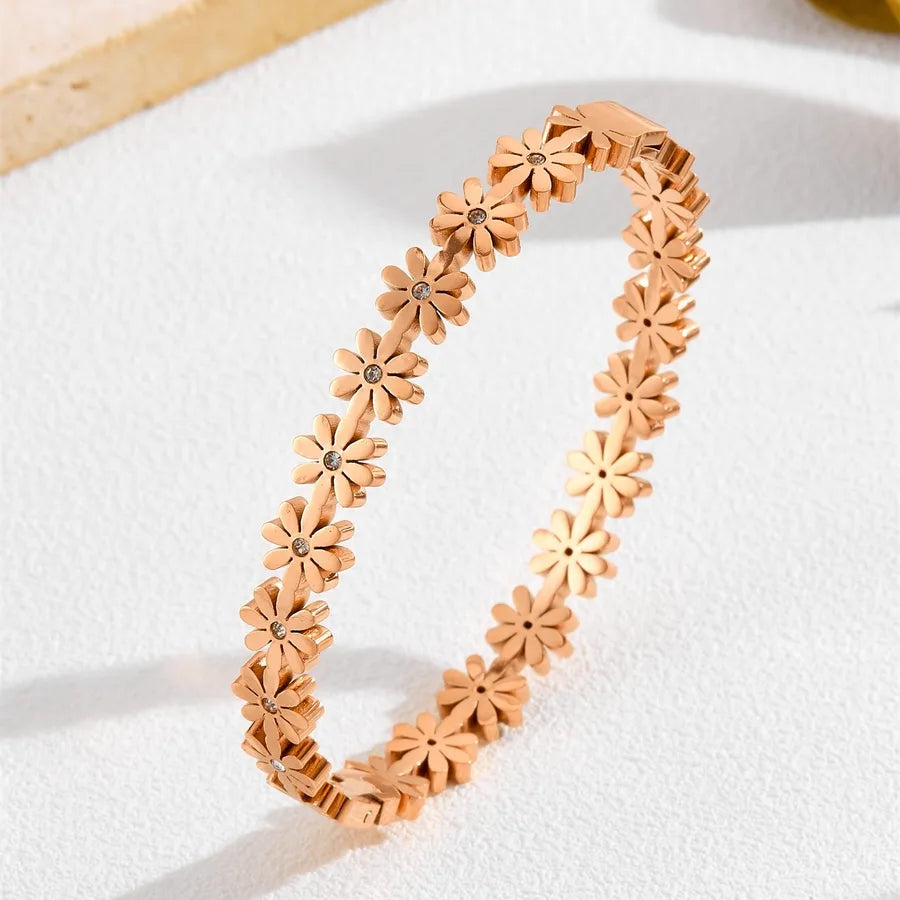 Elegant Sweet Flower Titanium Steel 18K Gold Plated Rhinestones Bangle In Bulk