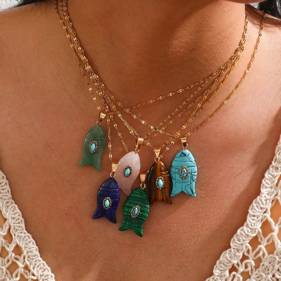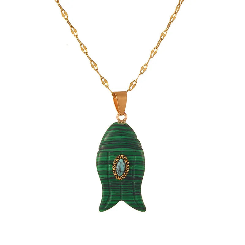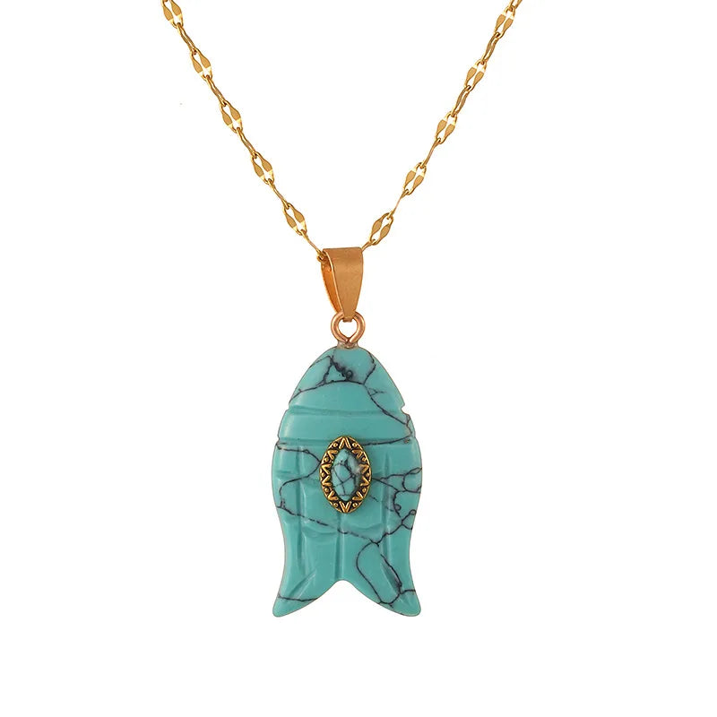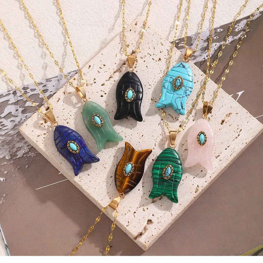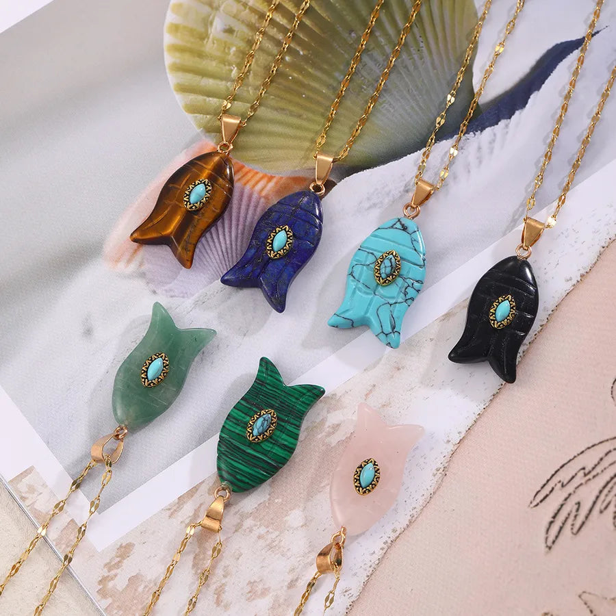 Fashionable Natural Stone Round Small Fish Square Titanium Steel Necklace Versatile Simple Pendant Women's Cold Style Jewelry