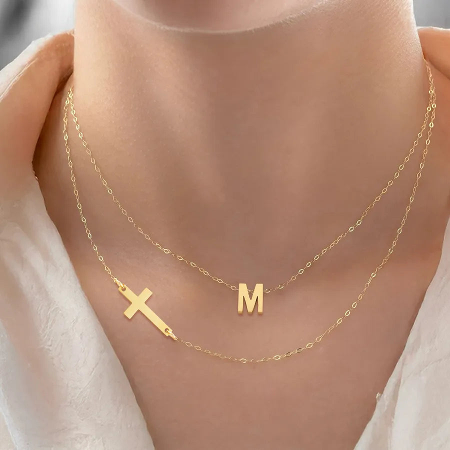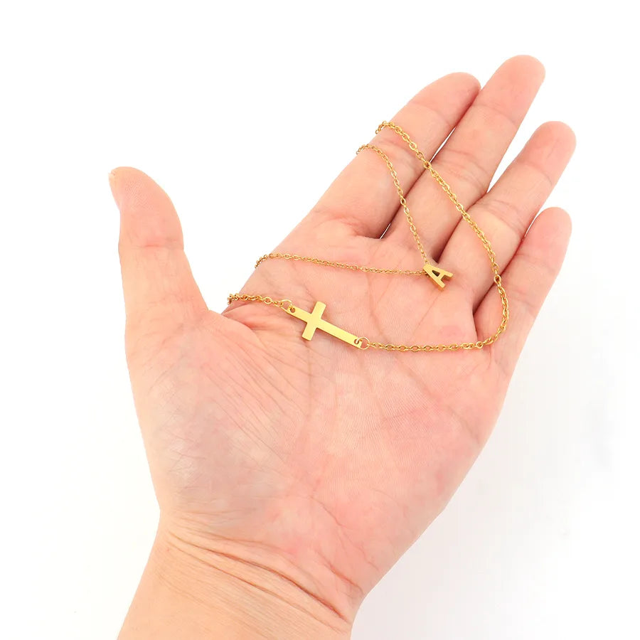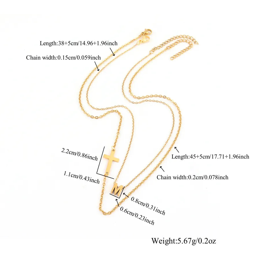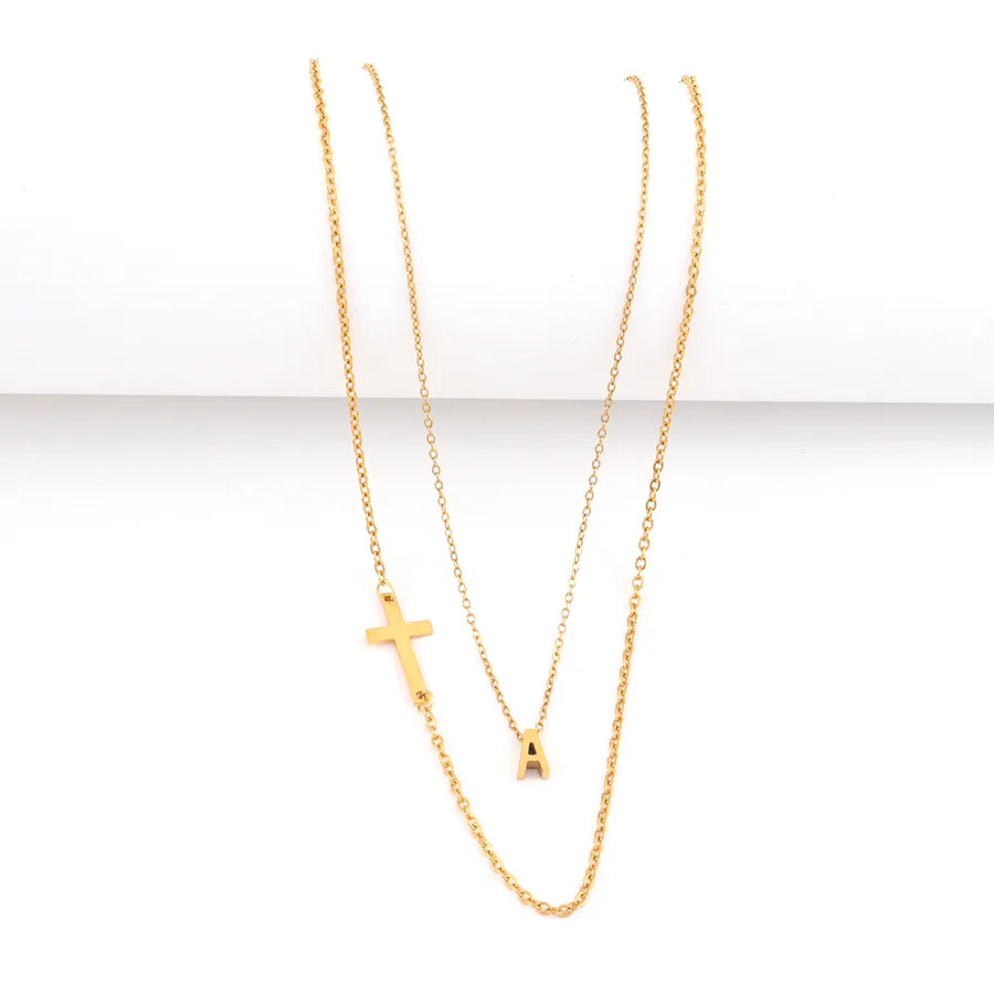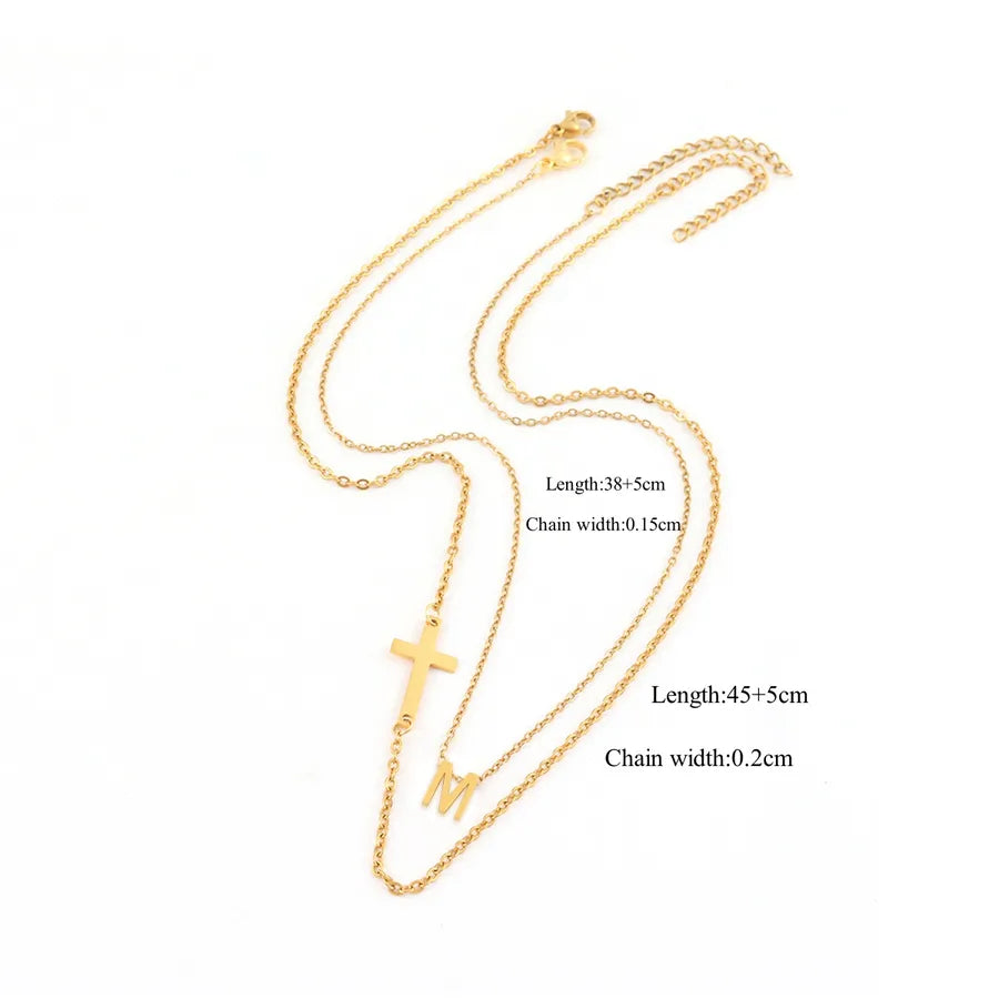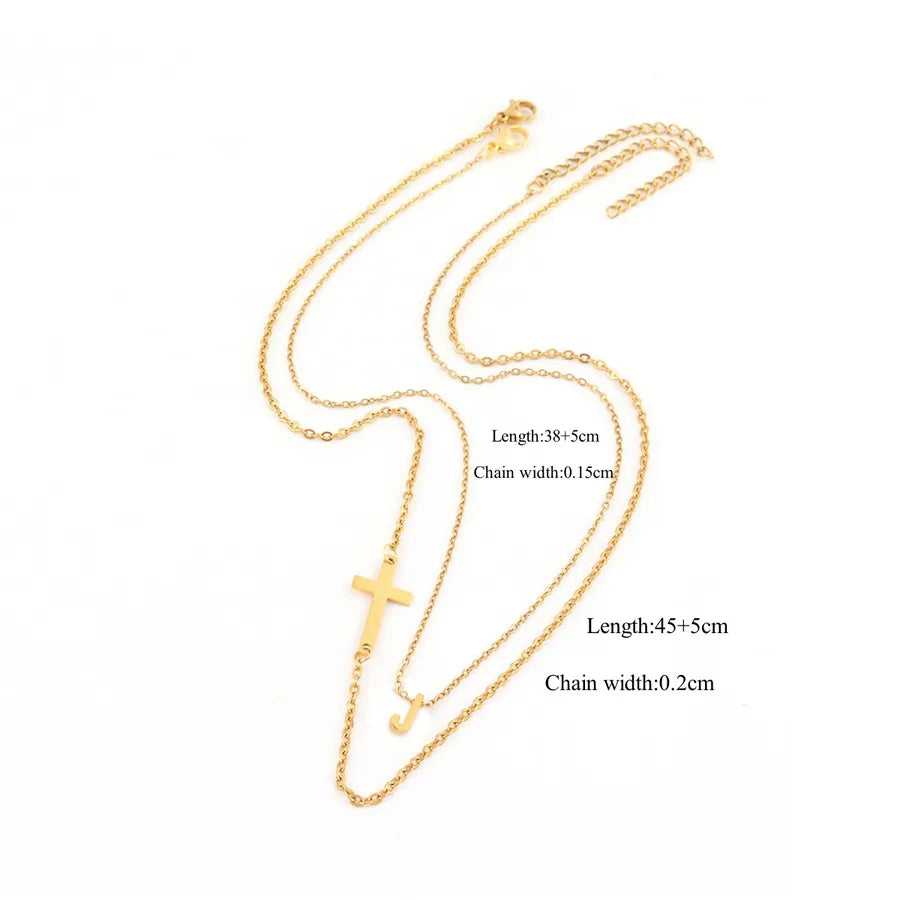 Gold Plated Stainless Steel Cross Initial Pendant Necklace Set For Women Elegant Minimalist Versatile 2-Piece Jewelry Combo