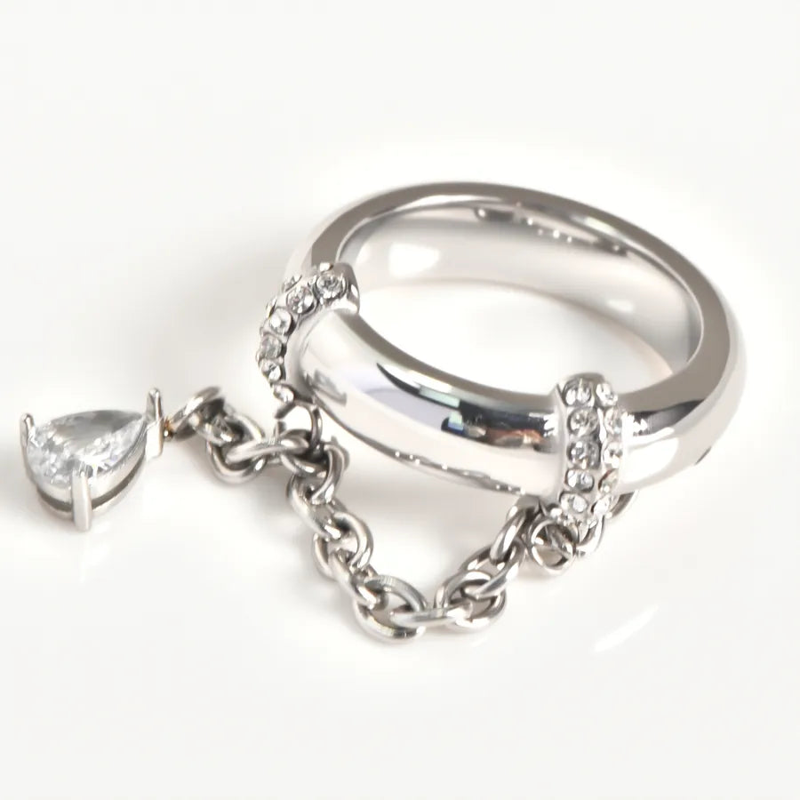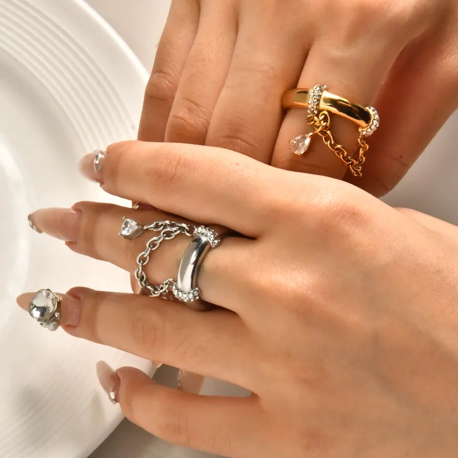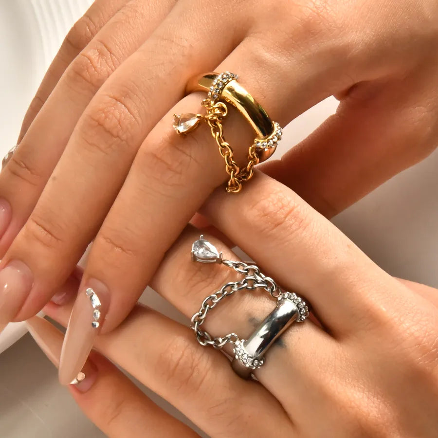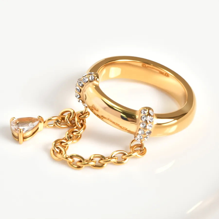 Golden Chain Ring With Diamond Embedded Waterdrop Pendant Design Luxury Glitzy Gold Plated Stainless Steel Ring For Women