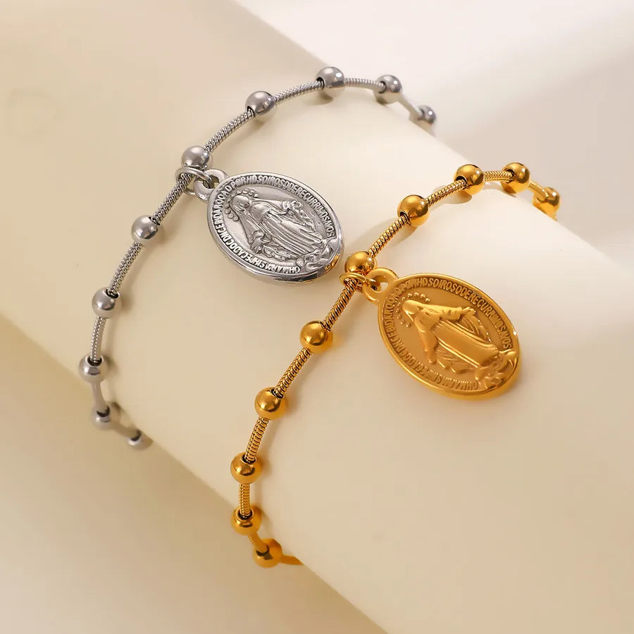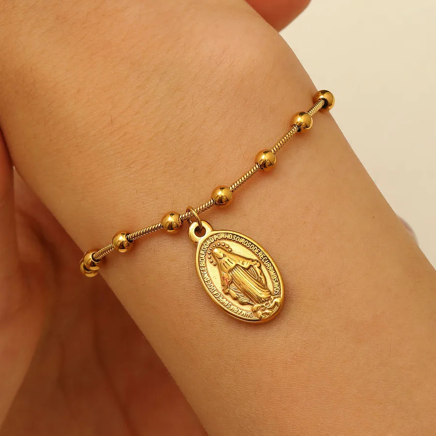 Ladies Stainless Steel Pendant Cross Round Beaded Bracelet European Style Electroplated Oval Shape Mother Mary Is The Cross
