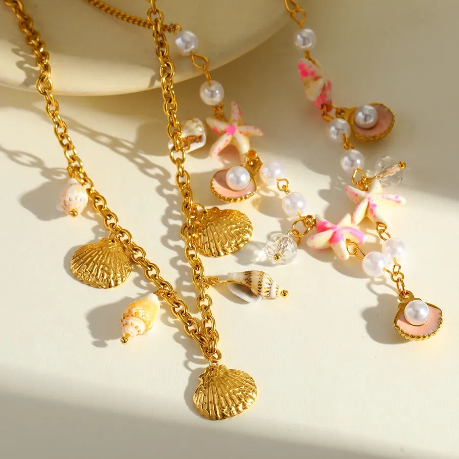 Romantic Beach Style 18K Gold Plated Stainless Steel Faux Pearl Starfish Shell Pendant Necklace Casual Everyday Date Selfie Jewelry