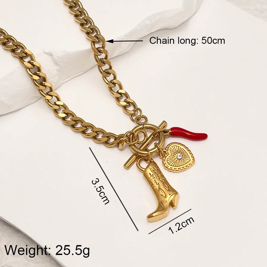 Wholesale Jewelry Vintage Style Cowboy Style Heart Shape chili Boots 304 Stainless Steel 18K Gold Plated Pendant Necklace None